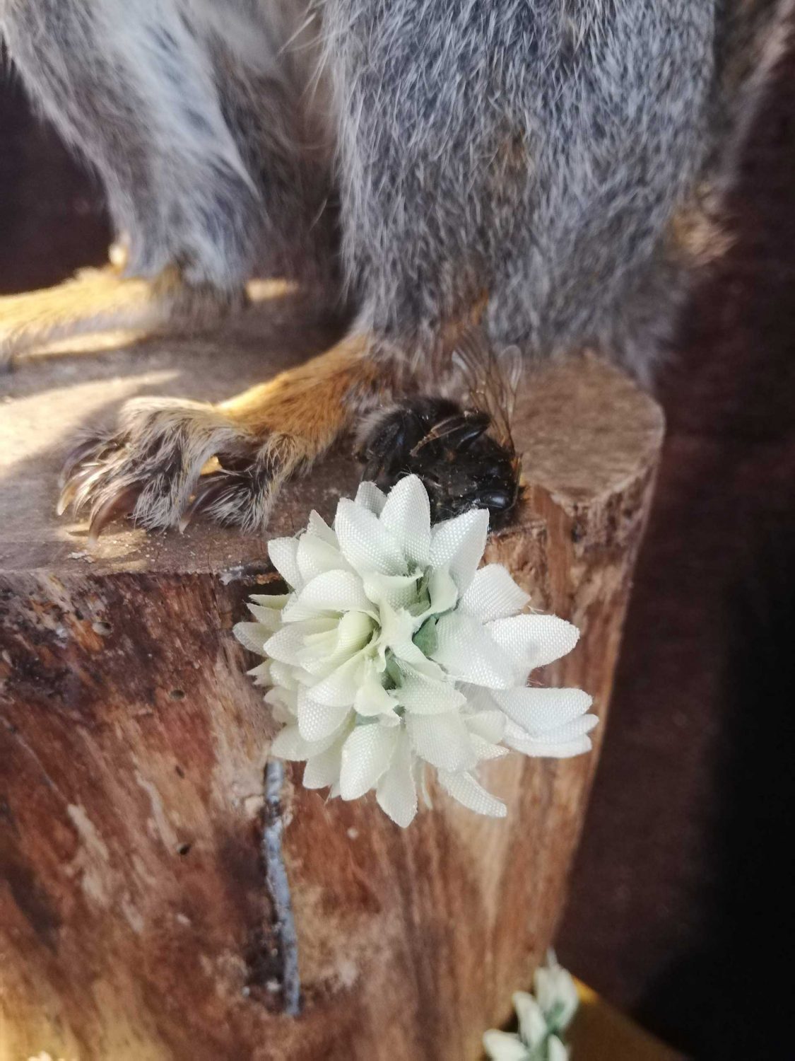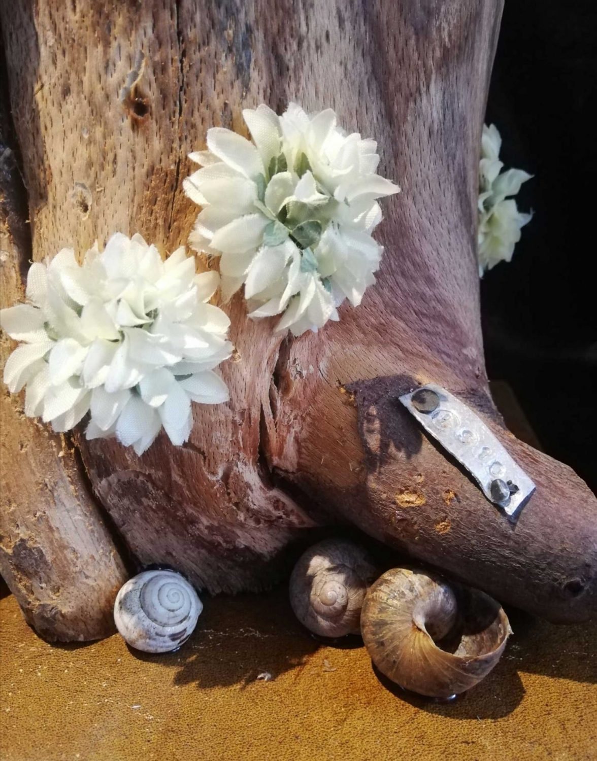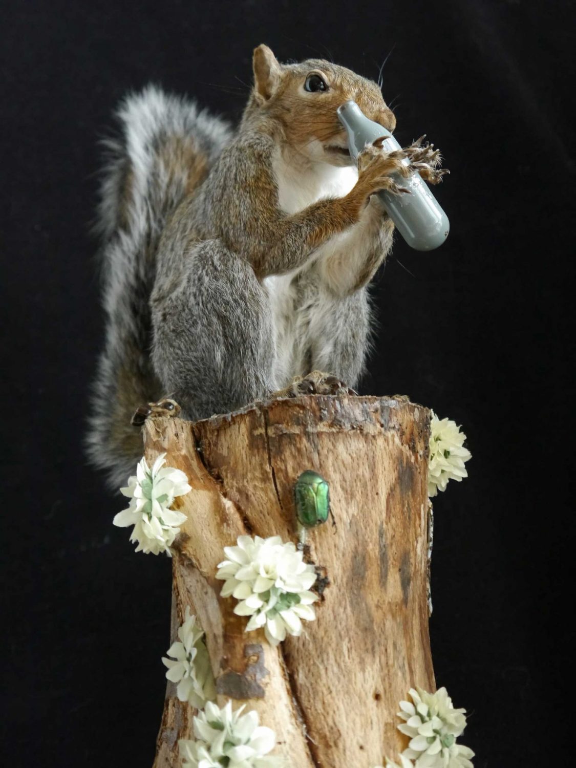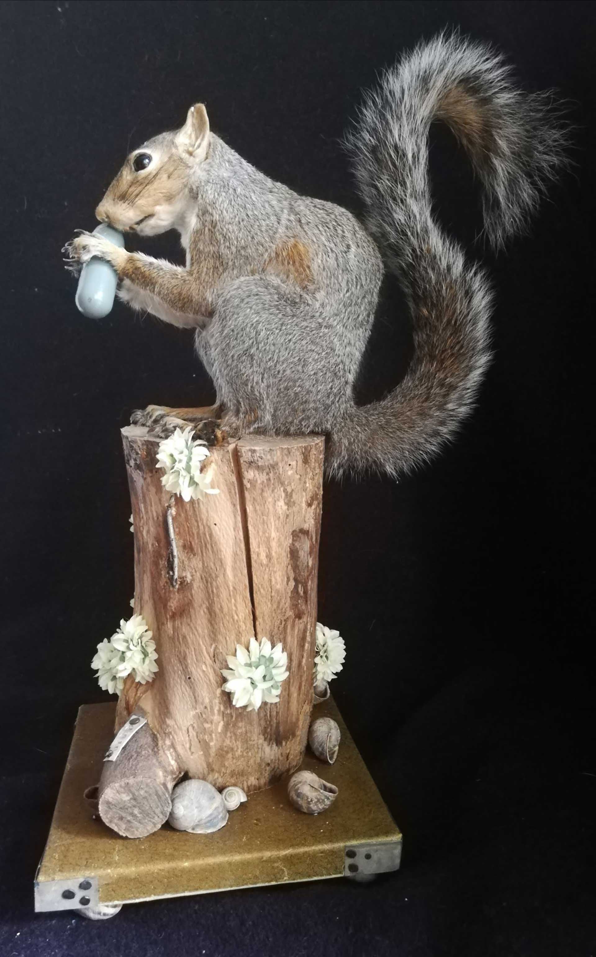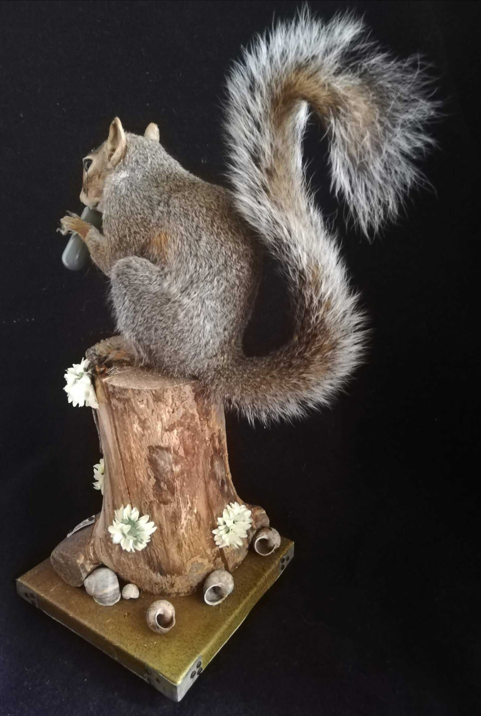I present the squirrel on a plinth which is made of reclaimed wood, leather and has zinc corners. It stands on four snail shells.